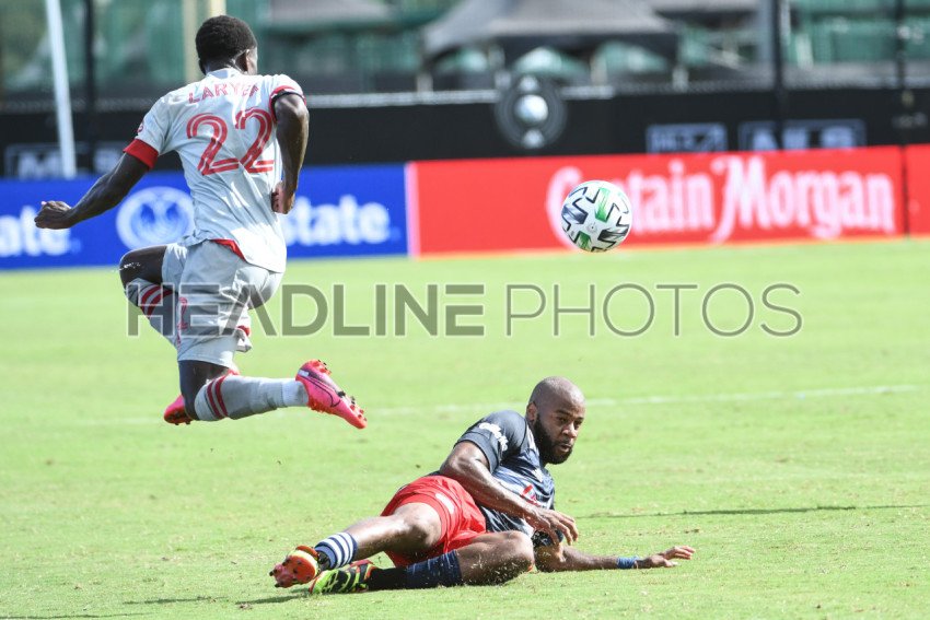 Toronto FC defender Laryea, Richie #22 leaps over New England Revolution defender Farrell, Andrew #2 during the MLS is Back Tournament at ESPN Wild World of Sports in Orlando Florida USA on Tuesday July 21, 2020. Photo Credit: Marty Jean-Louis