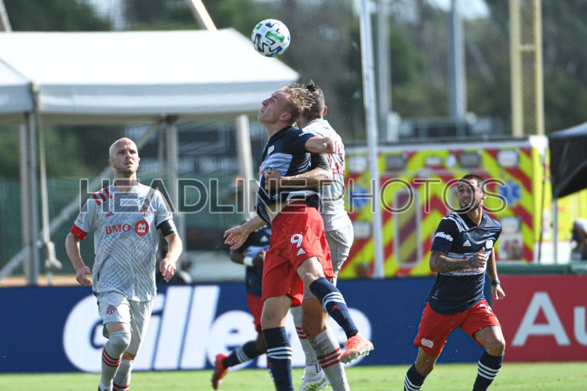 New England Revolution forward Buksa, Adam #9 wins the header during the MLS is Back Tournament at ESPN Wild World of Sports in Orlando Florida USA on Tuesday July 21, 2020. Photo Credit: Marty Jean-Louis
