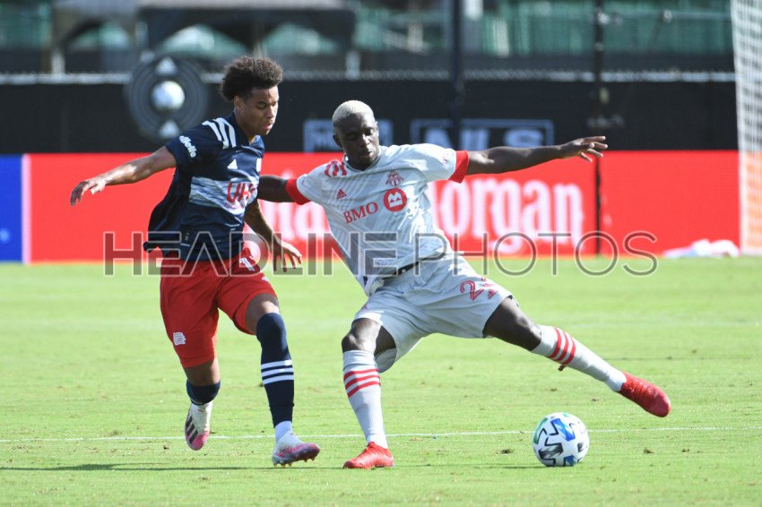 Toronto FC midfielder DeLeon, Nick #15 and the New England Revolution defender Bye, Brandon #15 fight for the ball during the MLS is Back Tournament at ESPN Wild World of Sports in Orlando Florida USA on Tuesday July 21, 2020. Photo Credit: Marty Jean-Louis