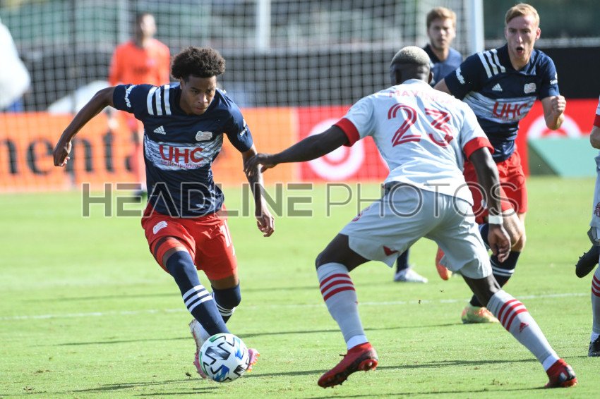 New England Revolution forward Buchanan, Tajon #17 attempt to make a run pass Toronto's defender Mavinga, Chris #23 during the MLS is Back Tournament at ESPN Wild World of Sports in Orlando Florida USA on Tuesday July 21, 2020. Photo Credit: Marty Jean-Louis