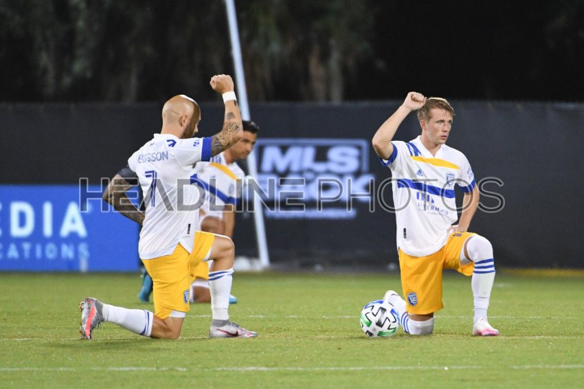 San Jose Earthquakes playeers kneel in Solidarity of the Black Lives Matter Movement during the MLS is Back Tournament at ESPN Wild World of Sports in Orlando Florida on Wednesday July 15, 2020. Photo Credit: Marty Jean-Louis