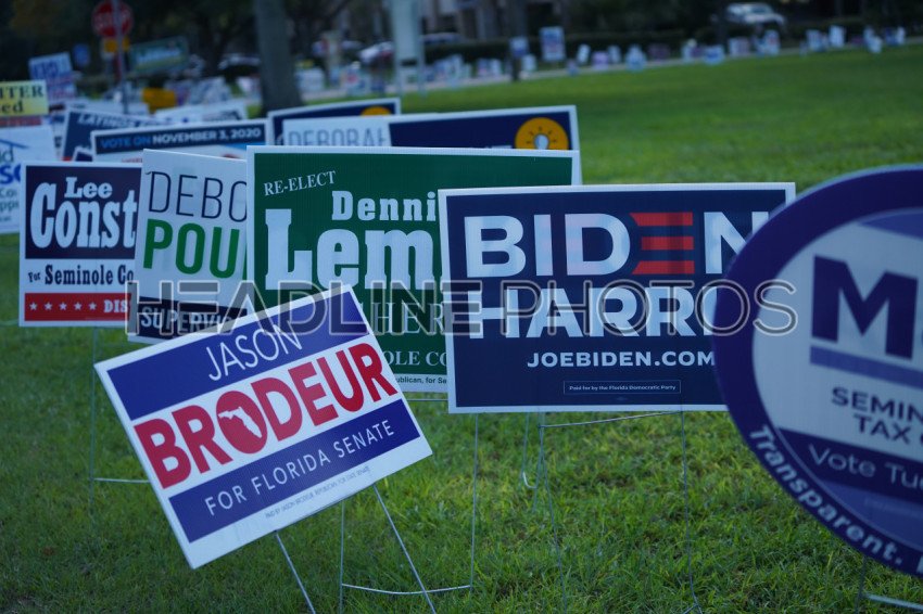 Biden and Harris Signs among many place on the grass at the Supervise of Elections Office in Sanford Florida USA on Thursday October 29, 2020. Photo Credit: Marty Jean-Louis