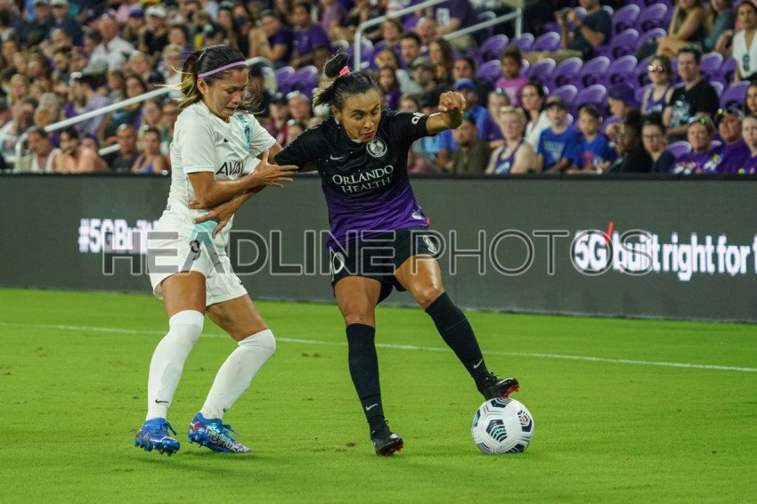 Orlando, Florida, USA, October 9, 2021, Orlando Pride player Marta #10 controls the ball as Nahomi Kawasumi #9 puts pressure during the first half at Exploria Stadium. (Photo Credit: Marty Jean-Louis)