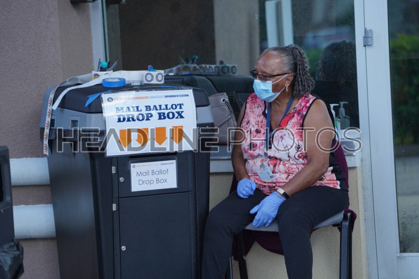 A worker is sat next to the Mail Ballot Drop Box at the Supervise of Elections Office in Sanford Florida USA on Thursday October 29, 2020. Photo Credit: Marty Jean-Louis