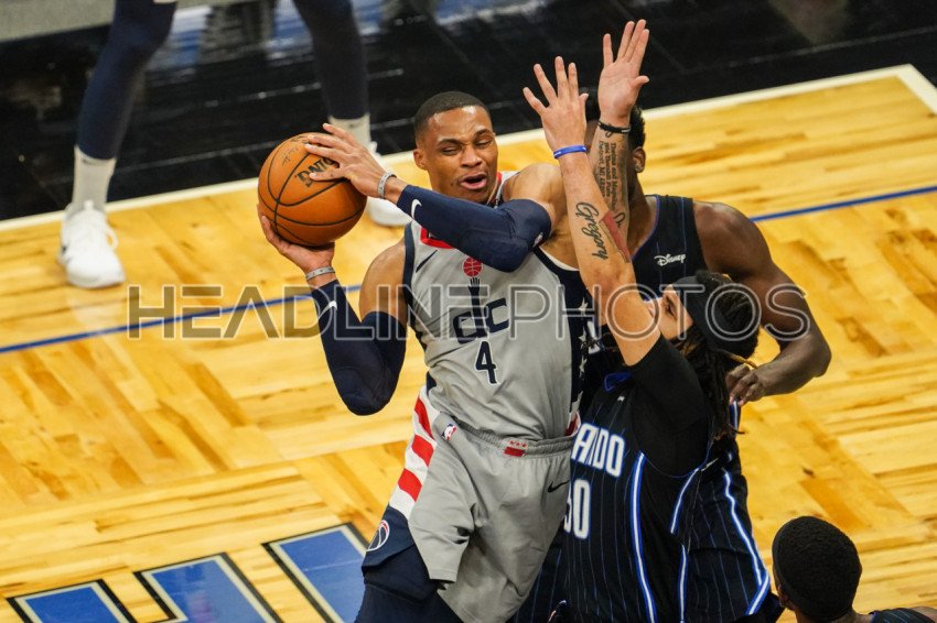 Orlando, Florida, USA, April 7, 2021, Washington Wizards Point Guard Russell Westbrook #4 attempt to make a pass during the game against the Orlando Magic at the Amway Center (Photo Credit: Marty Jean-Louis)