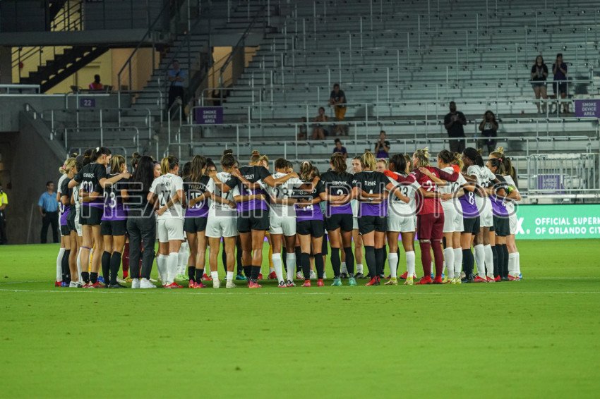 Orlando, Florida, USA, October 9, 2021, Gotham FC and Orlando Pride players makes a circle in midfield as a symbol of unity to fight against sexual abuse in the league at Exploria Stadium. (Photo Credit: Marty Jean-Louis)