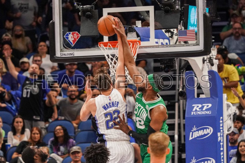 Orlando, Florida, USA, October 13, 2021, Orlando Magic player Franz Wagner #22 attempt to make a basket but is blocked by Celtic's Bruno Fernando #28 during the second half at the Amway Center. (Photo Credit: Marty Jean-Louis)