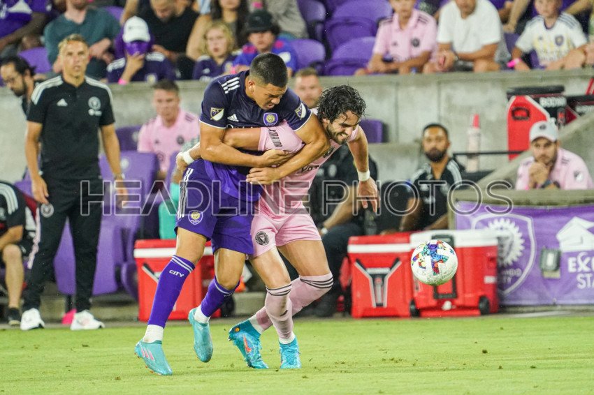 Orlando, Florida, USA, July 9, 2022, Inter Miami player Leonardo Campana #9 fight to keep the ball from Orlando City SC player at Exploria Stadium. (Photo Credit: Marty Jean-Louis)