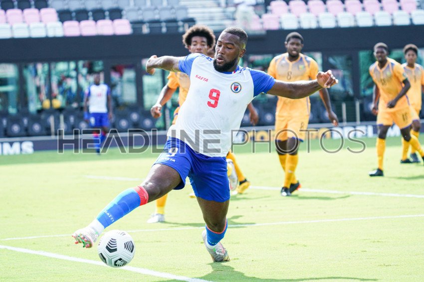 Fort Lauderdale, Florida, USA, July 2, 2021, Haiti forward Duckens Nazon #9 attempt to save the ball during the match at Drive Pink Stadium. (Photo Credit: Marty Jean-Louis)