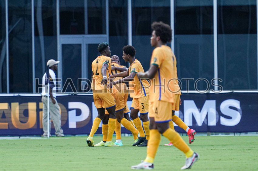 Fort Lauderdale, Florida, USA, July 2, 2021, Saint Vincent and the Grenadines players celebrate goal against Haiti at Drive Pink Stadium. (Photo Credit: Marty Jean-Louis)
