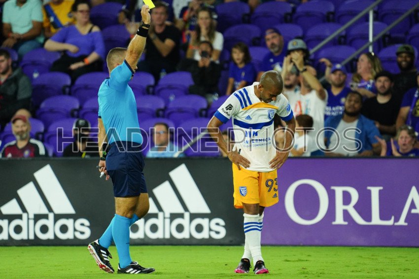Orlando, Florida, USA, June 22, 2021, San Jose Earthquakes Midfielder Judson Silva Tavares #93 receives a yellow card during the match at Exploria Stadium. (Photo Credit: Marty Jean-Louis)