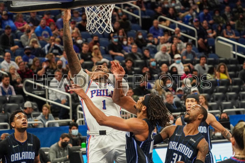 Orlando, Florida, USA, December 30, 2021, Philadelphia 76ers Center Andre Drummond #1 attempt to make a layup at the Amway Center. (Photo Credit: Marty Jean-Louis)