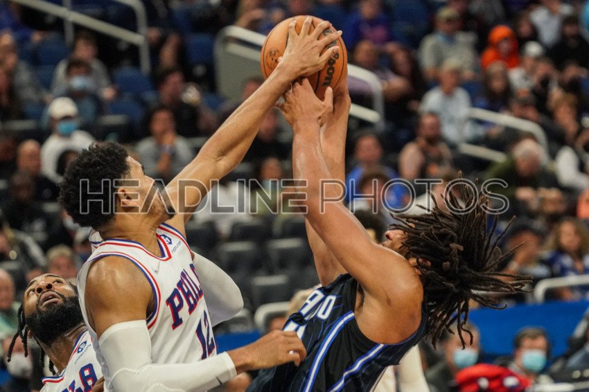 Orlando, Florida, USA, December 30, 2021, Philadelphia 76ers Forward Tobias Harris #12 and Orlando Magic Forward Freddie Gillespie #44 fight for the ball during the second half at the Amway Center. (Photo Credit: Marty Jean-Louis)