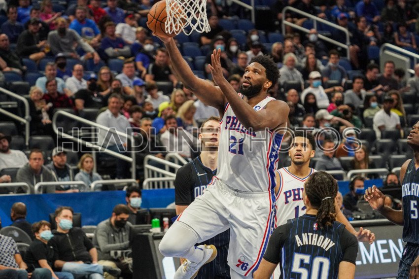 Orlando, Florida, USA, December 30, 2021, Philadelphia 76ers Center Joel Embiid #21 makes a layup at the Amway Center. (Photo Credit: Marty Jean-Louis)