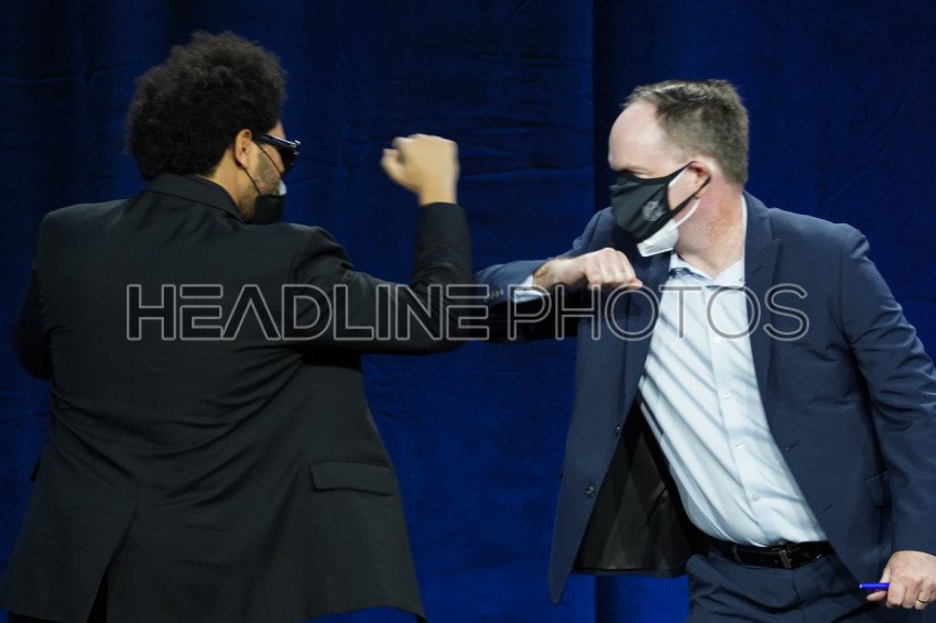 Tampa, Florida, USA, February 4, 2021, The Weeknd and Brian MCarthy elbows each other during Super Bowl LV Half Time Show Press Conference (Photo Credit: Marty Jean-Louis)