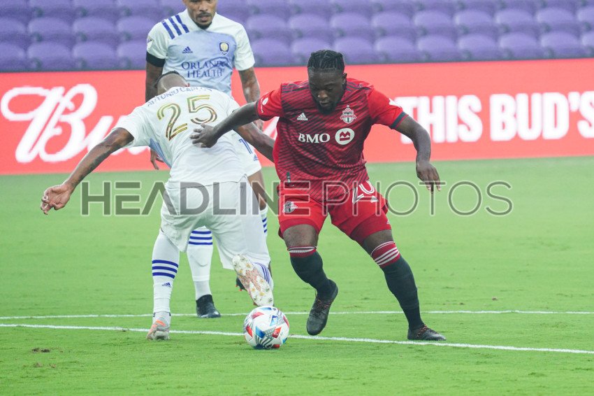 Orlando, Florida, USA, June 19, 2021, Toronto FC forward Ayo Akinola #20 steals the ball from Orlando's Antonio Carlos #25 at Exploria Stadium. (Photo Credit: Marty Jean-Louis)