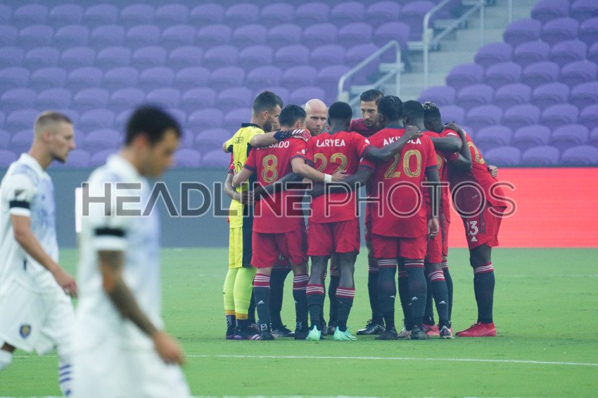 Orlando, Florida, USA, June 19, 2021,Toronto FC players huddle before the match begins at Exploria Stadium. (Photo Credit: Marty Jean-Louis)