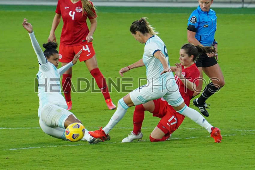 Orlando, Florida, USA, February 21, 2021, Argentinian and Canadian players fight for the ball during the SheBelieves Cup at Exploria Stadium (Photo Credit: Marty Jean-Louis)