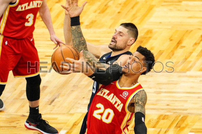 Orlando, Florida, USA, March 3, 2021, Atlanta Hawks John Collins #20 and the Orlando Magic's Nikola Vucevic #9 fight for the ball at the Amway Center (Photo Credit: Marty Jean-Louis)