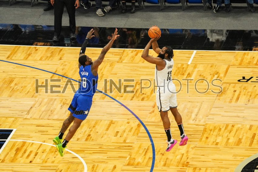 Orlando, Florida, USA, March 19, 2021, Brooklyn Nets player James Harden #13 shoots a three point against the Orlando Magic at the Amway Center (Photo Credit: Marty Jean-Louis)