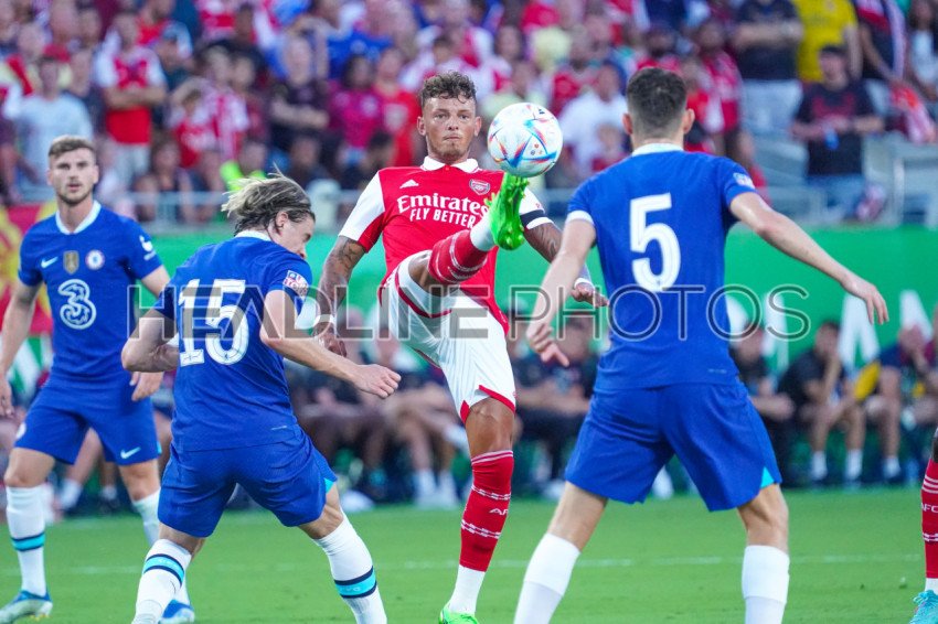 Orlando, Florida, USA, July 23, 2022, Arsenal FC player Ben White #4 receives a pass in the first half at Camping World Stadium in a Friendly Match. (Photo Credit: Marty Jean-Louis)