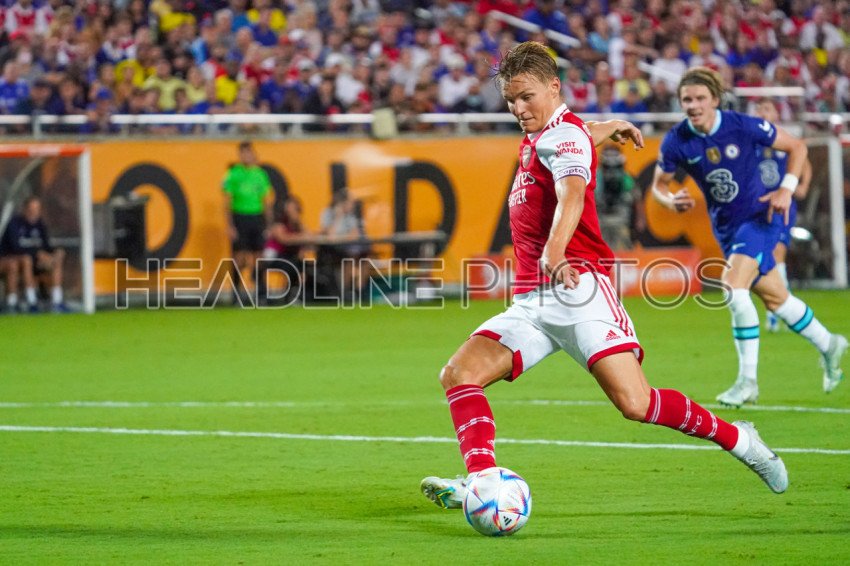 Orlando, Florida, USA, July 23, 2022, Arsenal FC player Martin Odegaard #8 shoots and scores against Chelsea at Camping World Stadium in a Friendly Match. (Photo Credit: Marty Jean-Louis)