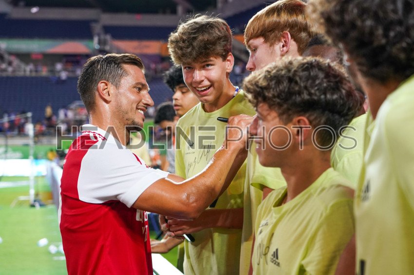 Orlando, Florida, USA, July 23, 2022, Arsenal FC player Cedrick Soares #17 signs a fan's t-shirt at Camping World Stadium in a Friendly Match. (Photo Credit: Marty Jean-Louis)