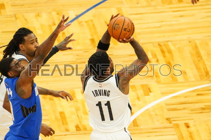 Orlando, Florida, USA, March 19, 2021, Brooklyn Nets Point Guard Kyrie Irving #11 shoots a three point against the Orlando Magic at the Amway Center (Photo Credit: Marty Jean-Louis)