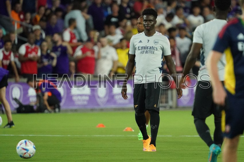 Orlando, Florida, USA, July 20, 2022, Arsenal FC forward Bukayo Saka warming up at Exploria Stadium in a Friendly Match. (Photo Credit: Marty Jean-Louis)