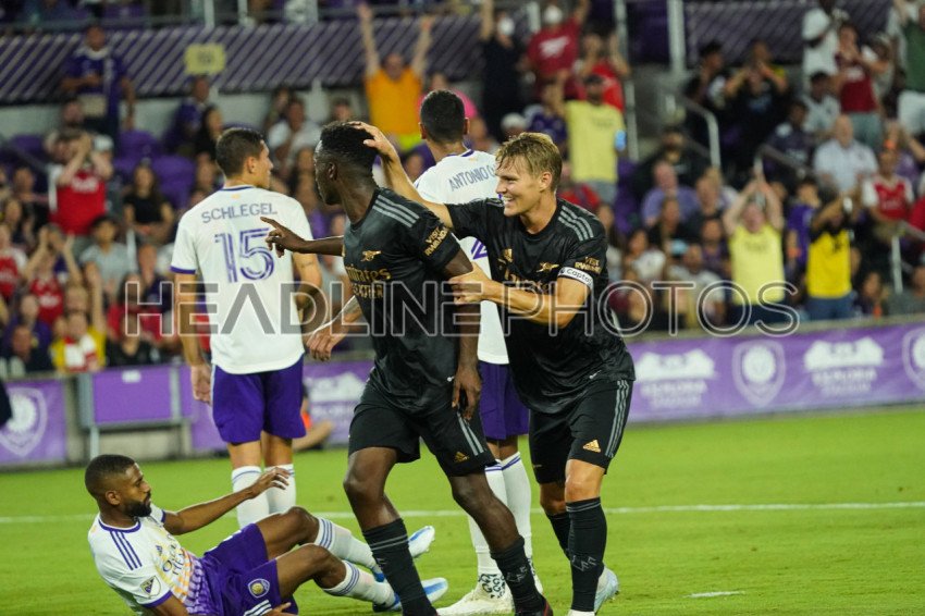 Orlando, Florida, USA, July 20, 2022, Arsenal FC players Eddie Nketiah and Martin Odegaard celebrate after scoring against Orlando City at Exploria Stadium in a Friendly Match. (Photo Credit: Marty Jean-Louis)