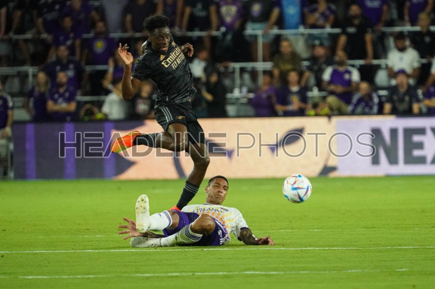 Orlando, Florida, USA, July 20, 2022, Arsenal FC forward Albert Sambi Lokonga #23 jumps from the slide tackle from Orlando City defender Antonio Carlos #25 at Exploria Stadium in a Friendly Match. (Photo Credit: Marty Jean-Louis)