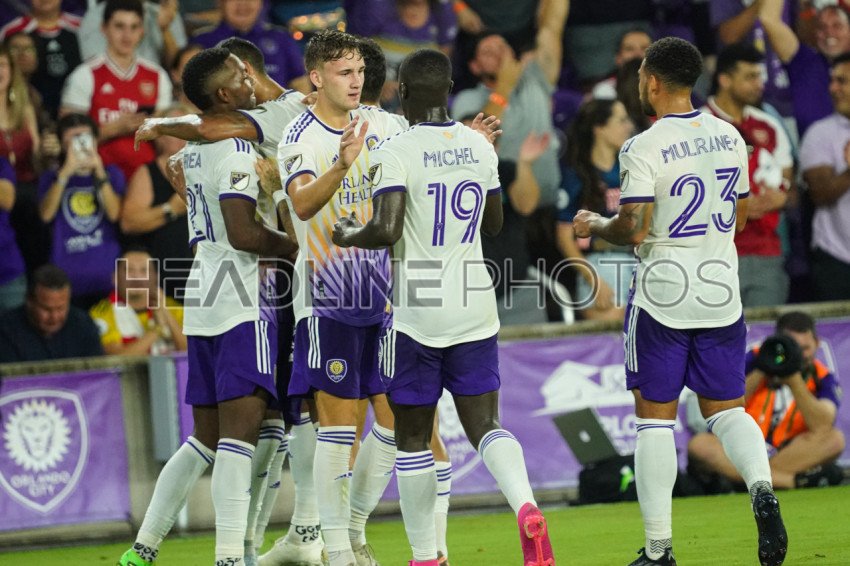 Orlando, Florida, USA, July 20, 2022, Orlando City players celebrate after goal at Exploria Stadium in a Friendly Match. (Photo Credit: Marty Jean-Louis)