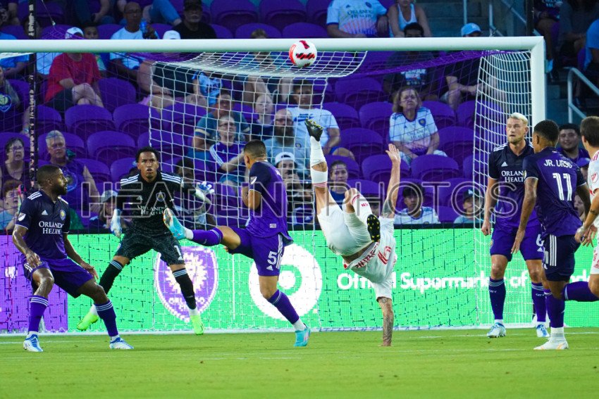 Orlando, Florida, USA, July 27, 2022, New York Red Bulls player Patryk Kilmala #9 makes a bicycle kick in an attempt to score against Orlando City SC during the US Open Cup Semi Finals at Exploria Stadium. (Photo Credit: Marty Jean-Louis)