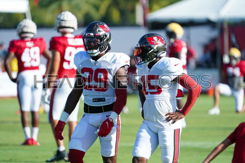 Tampa, Florida, USA, August 7, 2022, Tampa Bay Buccaneers players Cyril Grayson Jr. #15 and Rachaad White #29 during Training Camp at AdventHealth Training Center\n. (Photo Credit: Marty Jean-Louis)