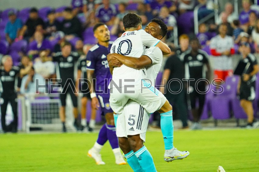 Orlando, Florida, USA, August 6, 2021, New England Revolution Midfielder Wilfrid Kaptoum #5 and Carles Gil #10 celebrate after scoring against Orlando City SC at Exploria Stadium. (Photo Credit: Marty Jean-Louis)