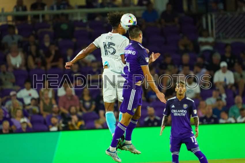 Orlando, Florida, USA, August 6, 2021, New England Revolution defender Brandon Bye #15 and Orlando City SC player Joao Moutinho #4 fight for the header at Exploria Stadium. (Photo Credit: Marty Jean-Louis)