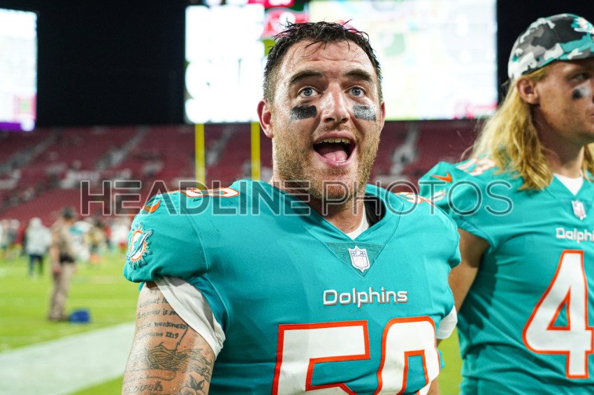 Tampa Bay, Florida, USA, August 13, 2022, Miami Dolphins linebacker Calvin Munson #50 celebrate after defeating the Tampa Bay Buccaneers at Raymond James Stadium. (Photo Credit: Marty Jean-Louis)