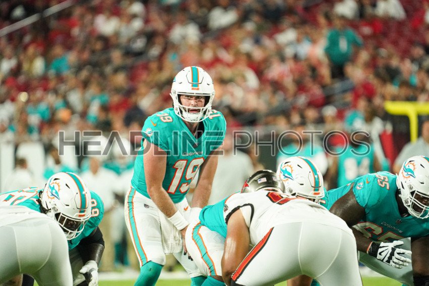 Tampa Bay, Florida, USA, August 13, 2022, Miami Dolphins Quarterback Skylar Thompson #19 readies to receive the ball at Raymond James Stadium. (Photo Credit: Marty Jean-Louis)