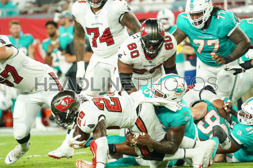 Tampa Bay, Florida, USA, August 13, 2022, Tampa Bay Buccaneers running back Rachaad White #29 gets sacked at Raymond James Stadium. (Photo Credit: Marty Jean-Louis)
