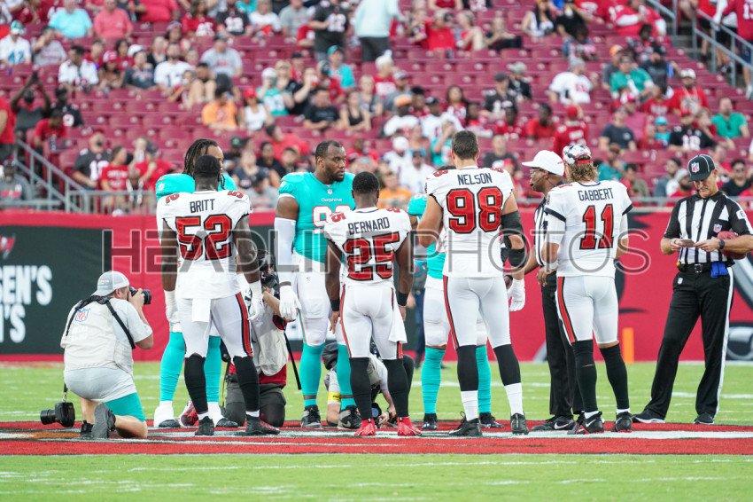 Tampa Bay, Florida, USA, August 13, 2022, Miami Dolphins and Tampa Bay Buccaneers players gather during the coin toss at Raymond James Stadium. (Photo Credit: Marty Jean-Louis)