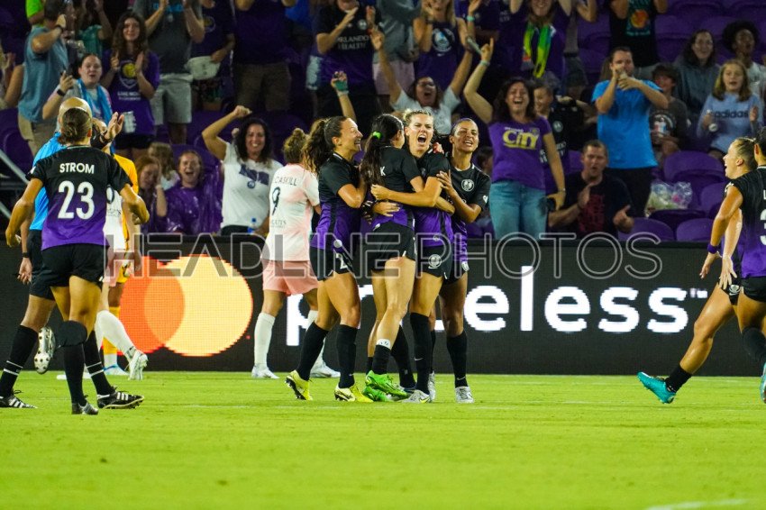 Orlando, Florida, USA, August 7, 2022, Orlando Pride players celebrate goal at Exploria Stadium. (Photo Credit: Marty Jean-Louis)