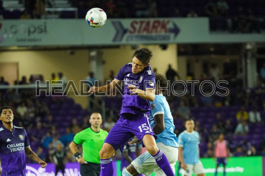 Orlando, Florida, USA, August 28, 2022, Orlando City SC defender Rodrigo Schlegel #15 wins the header at Exploria Stadium. (Photo Credit: Marty Jean-Louis)