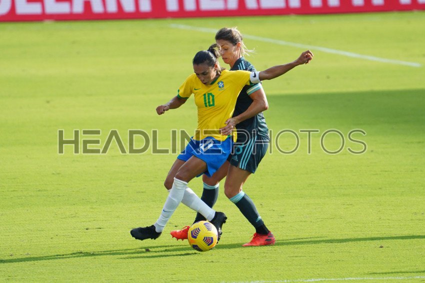 Orlando, Florida, USA, February 18, 2021, Brazilian and Argentinian players Marta #10 and Clarisa Huber #8 fight for the ball during the SheBelieves Cup at Exploria Stadium (Photo Credit: Marty Jean-Louis)