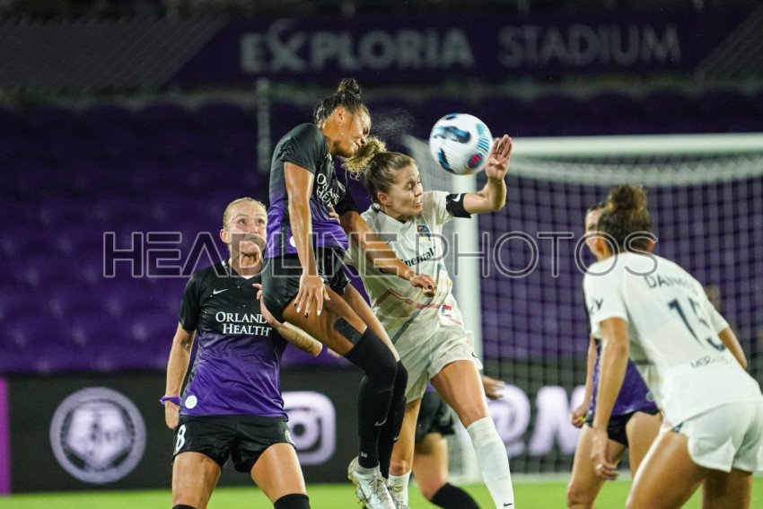 Orlando, Florida, USA, September 22, 2022, North Carolina Courage and Orlando Pride players fight for the header in the first half at Exploria Stadium. (Photo Credit: Marty Jean-Louis)