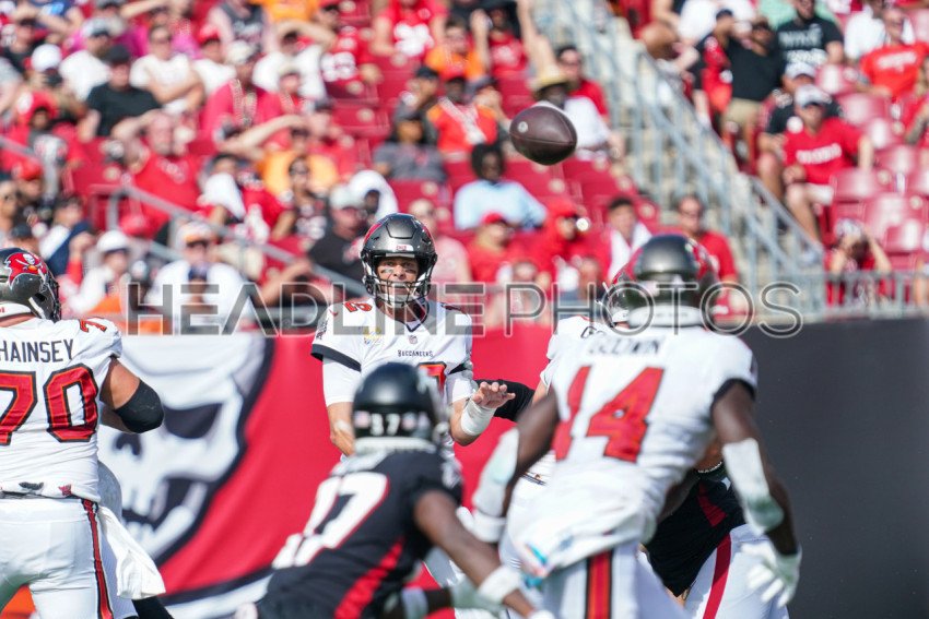 Tampa Bay, Florida, USA, October 9, 2022, Tampa Bay Buccaneers quarterback Tom Brady #12 makes a pass during the third quarter at Raymond James Stadium. (Photo Credit: Marty Jean-Louis)