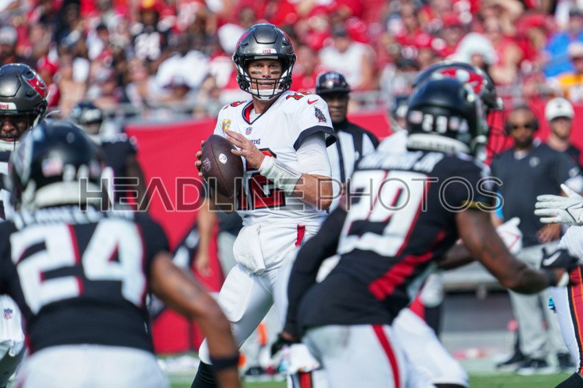 Tampa Bay, Florida, USA, October 9, 2022, Tampa Bay Buccaneers quarterback Tom Brady #12 looks to make a pass during the third quarter at Raymond James Stadium. (Photo Credit: Marty Jean-Louis)