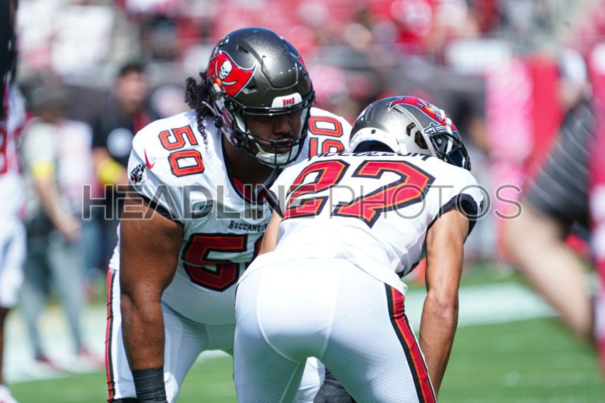 Tampa Bay, Florida, USA, October 9, 2022, Tampa Bay Buccaneers defensive lineman Vita Veam #50 warms up at Raymond James Stadium. (Photo Credit: Marty Jean-Louis)