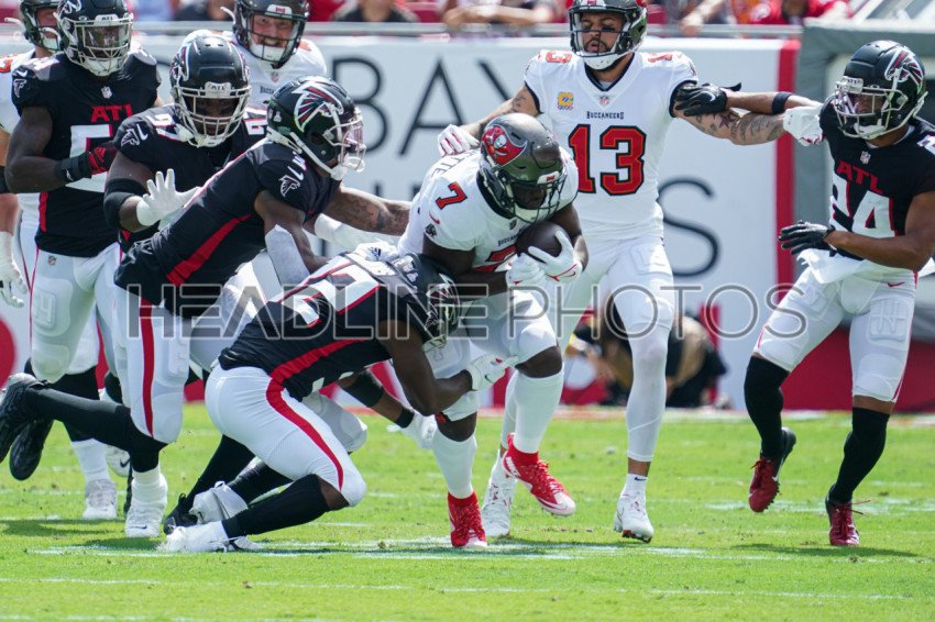 Tampa Bay, Florida, USA, October 9, 2022, Tampa Bay Buccaneers running back Leonard Fournette #7 gets tackled by Wide Receiver KhaDarel Hodge #12 in the first quarter at Raymond James Stadium. (Photo Credit: Marty Jean-Louis)