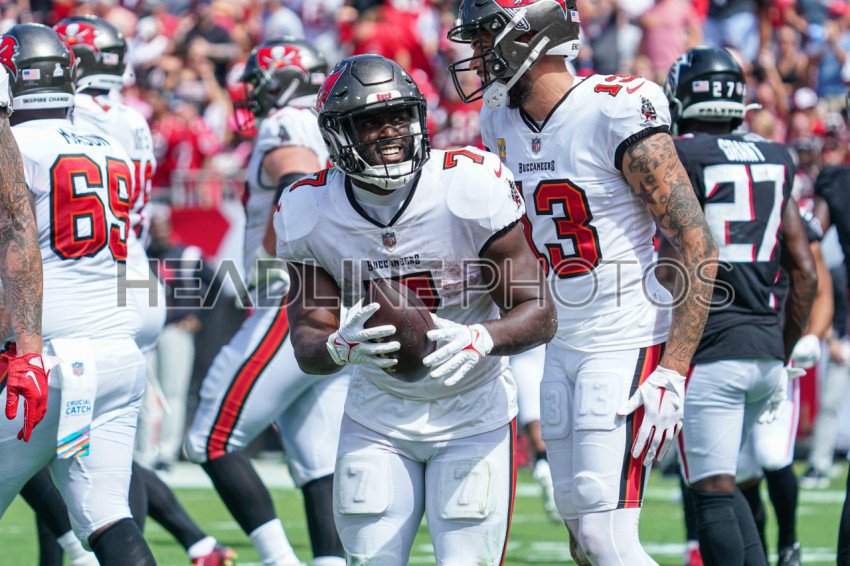 Tampa Bay, Florida, USA, October 9, 2022, Tampa Bay Buccaneers running back \nLeonard Fournette #7 smiles after making a touchdown at Raymond James Stadium. (Photo Credit: Marty Jean-Louis)