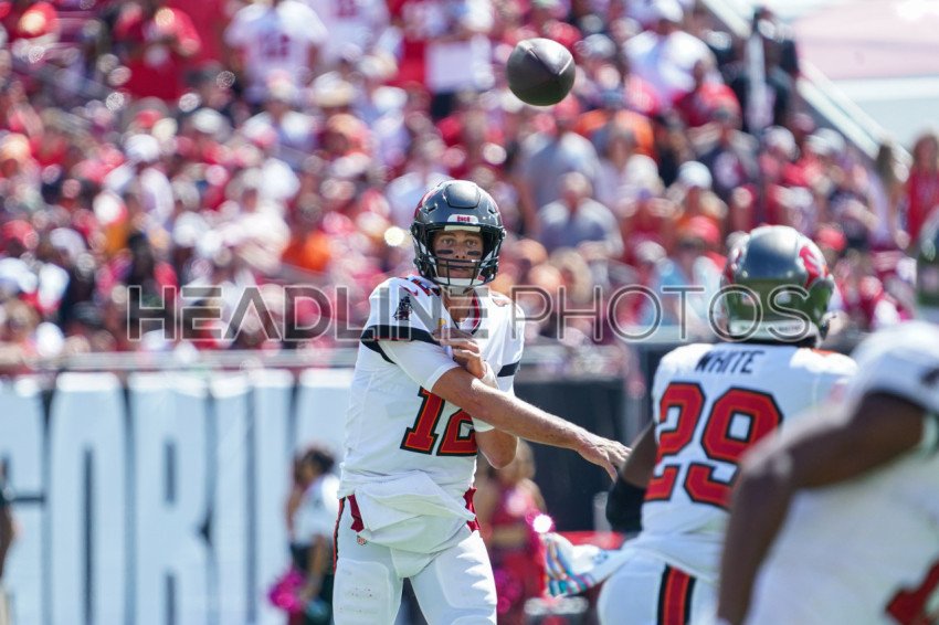 Tampa Bay, Florida, USA, October 9, 2022, Tampa Bay Buccaneers Quaterback Tom Brady #12 makes a pass during the game at Raymond James Stadium. (Photo Credit: Marty Jean-Louis)